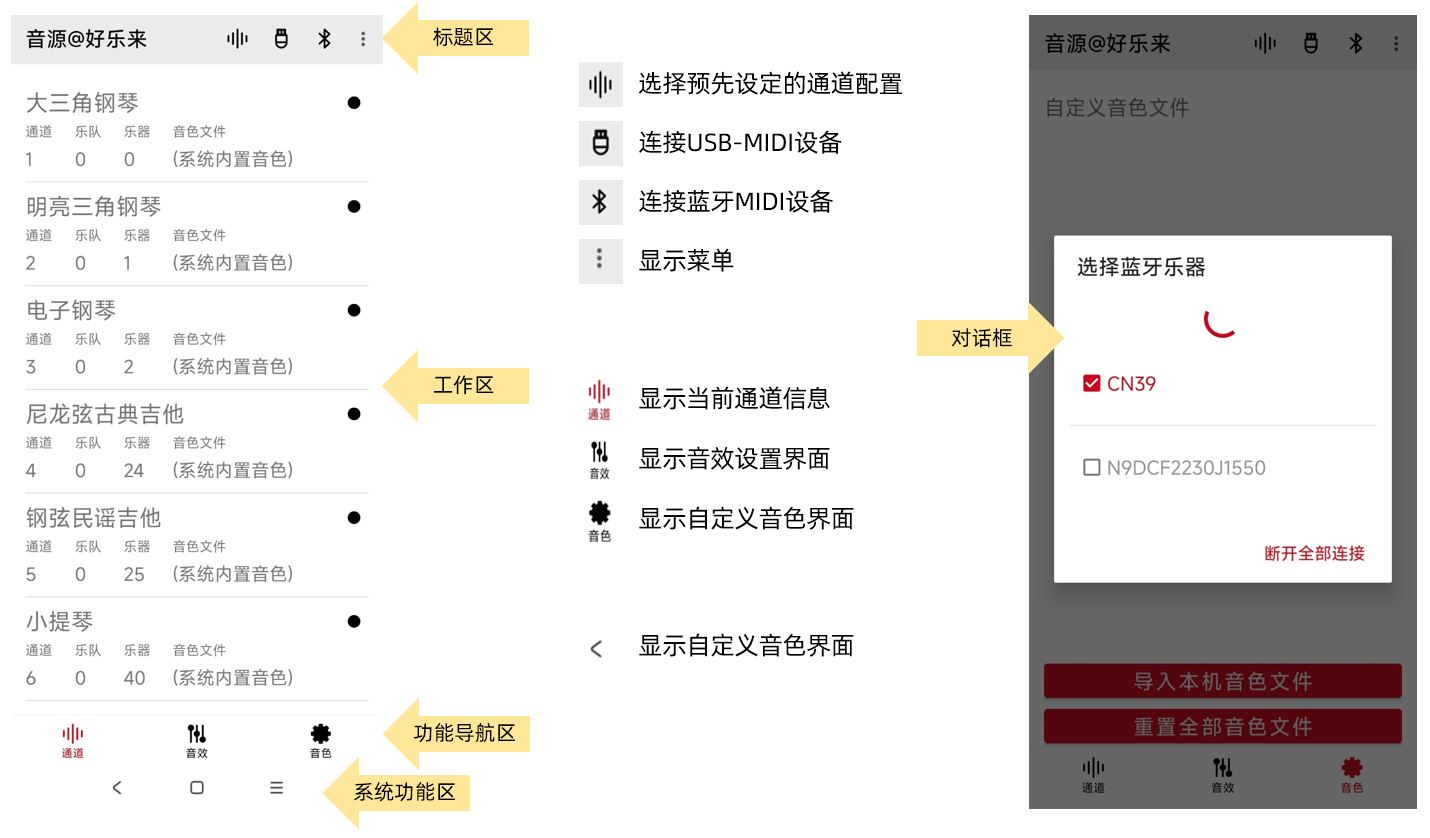 标题区有三个快捷功能按钮和一个菜单按钮,如上图所示分别是选择预设通道、连接USB-MIDI设备、连接蓝牙-MIDI设备,菜单项则包括语言、授权和关于。相关功能可参见“常见问题”中相关内容。
