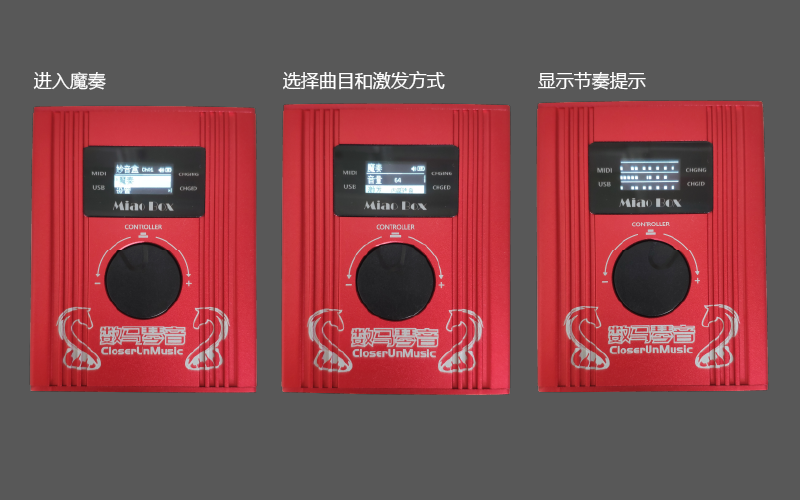 选择“魔奏”菜单项进入本功能以后,可以设置音量、激发方式、主音轨音色和曲目。激发方式包括“外部MIDI”和“内部转盘”。选择“外部MIDI”表示激发的指令来自3.5mmTRS MIDI插口或者USB-MIDI插口。选择“内部转盘”表示激发的指令来自红盒上的平面旋钮。设置完毕以后,可以选择“显示提示”进入到节奏提示窗口,便于按照窗口中提示的节奏进行演奏。