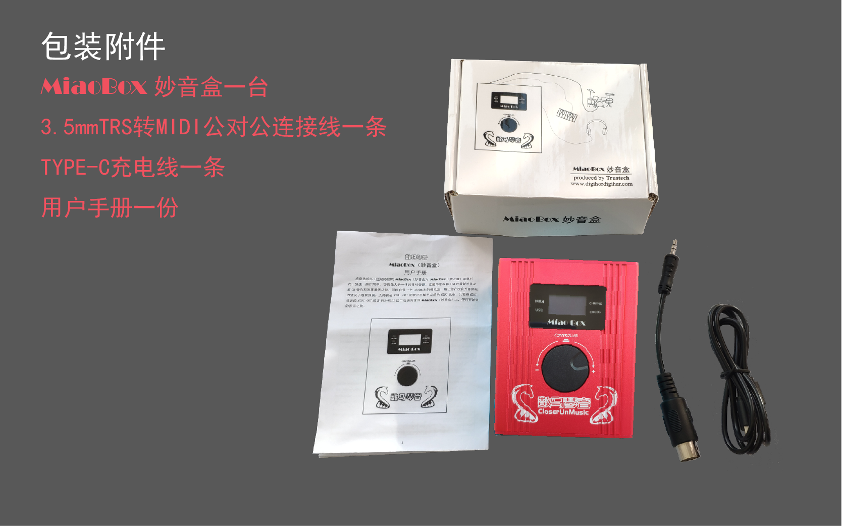 妙音盒迷你身材提供3.5mmTRS的MIDI接口,和USB-MIDI接口。随机附赠一条3.5mmTRS转5针MIDI公头。可以同时连接一台5针MIDI输出乐器和一台USB-MIDI输出乐器,可以进行双乐器同时演奏,实现一台琴(或电子乐器)伴奏,一台琴(或电子乐器)演绎旋律的演奏效果。USB-MIDI口能够发挥移动电源作用,能为外部低功耗乐器提供DC5V供电(输出电流≤500mA)。