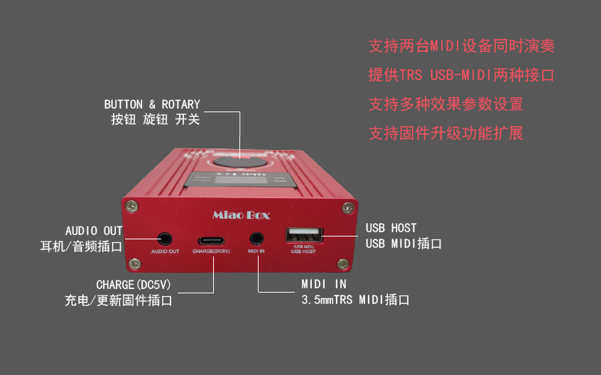 妙音盒的TYPE-C形式“充电/更新固件插口”,不仅能够对内置电池进行充电,还可以进行固件刷新升级,不断扩展系统功能。关于固件升级,具体可参见常见问题中“妙音盒红盒如何更新固件?”。